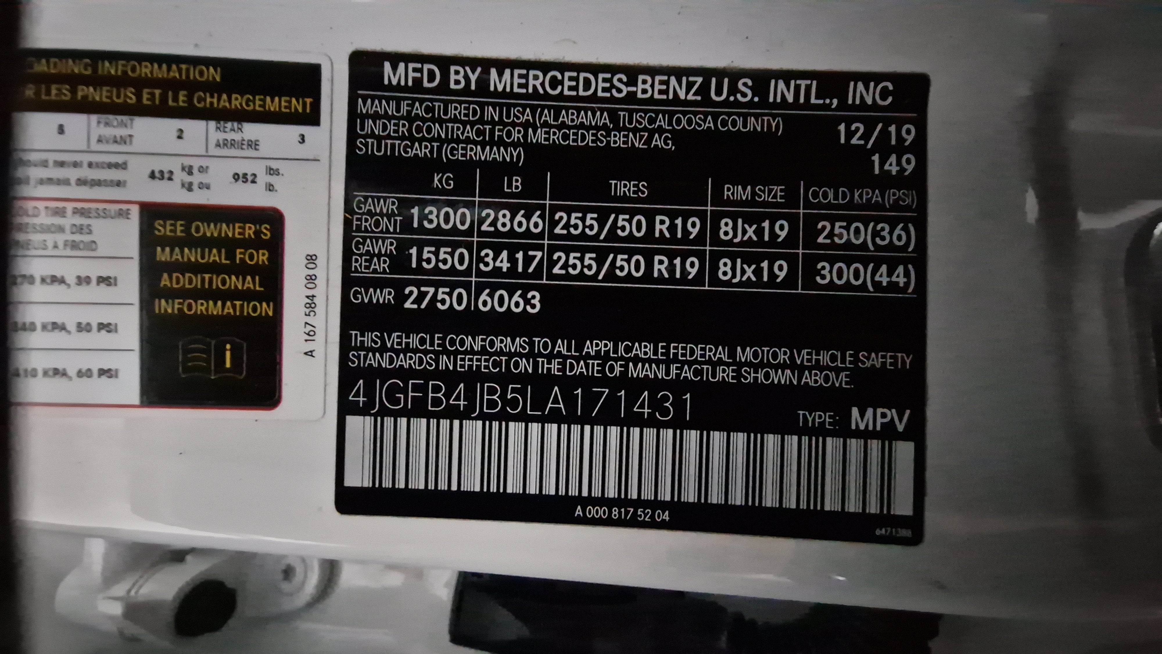 - Front Tire Size: P255/50HR19